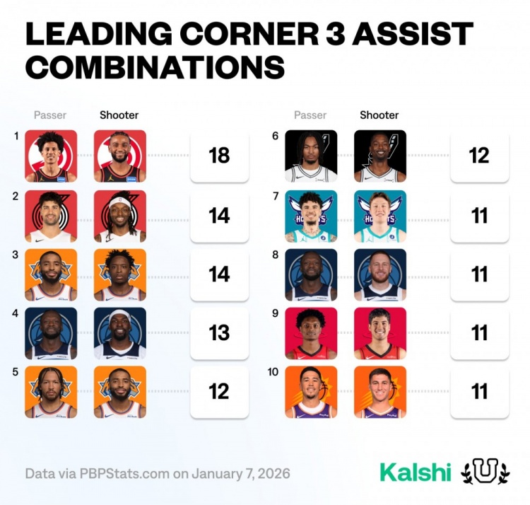 中国体育发展-本赛季底角三分传射组合榜:杰伦约+沃克高居第1 阿门+谢泼德上榜
